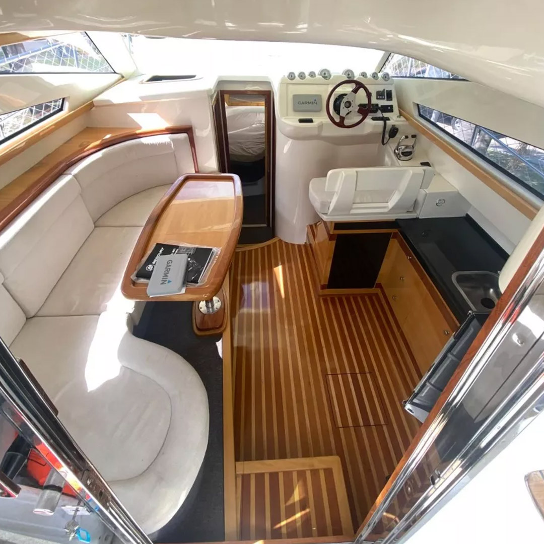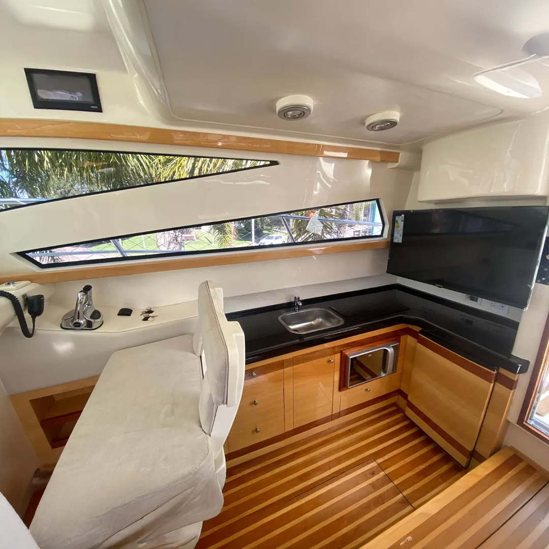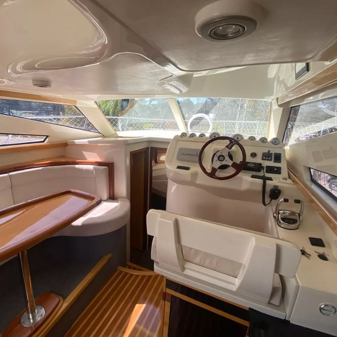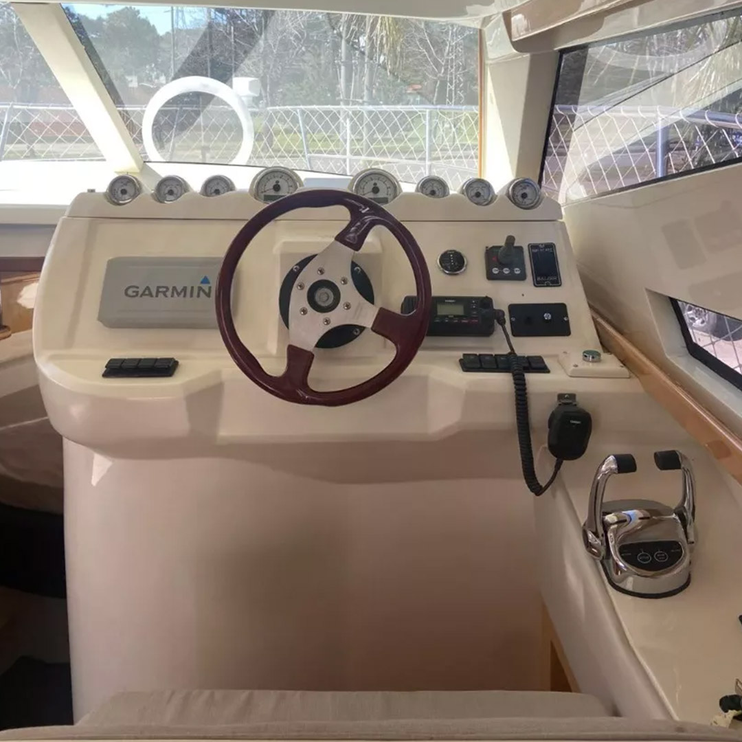 Diseñada para combinar elegancia, potencia y confort, la Aqualum 35 es una embarcación de líneas depuradas y sólida presencia. Su configuración bimotor Mercruiser 6.2L de 300 hp, acoplados a patas Bravo 3, ofrece un rendimiento superior, ideal tanto para navegación deportiva como para salidas recreativas de media distancia. Con capacidad para 9 personas y una eslora de 9.3 metros, brinda un amplio espacio de circulación y confort a bordo.