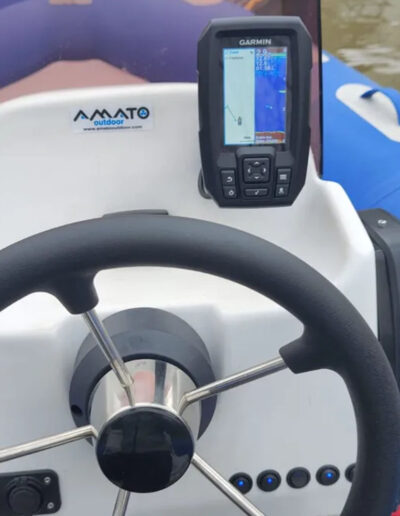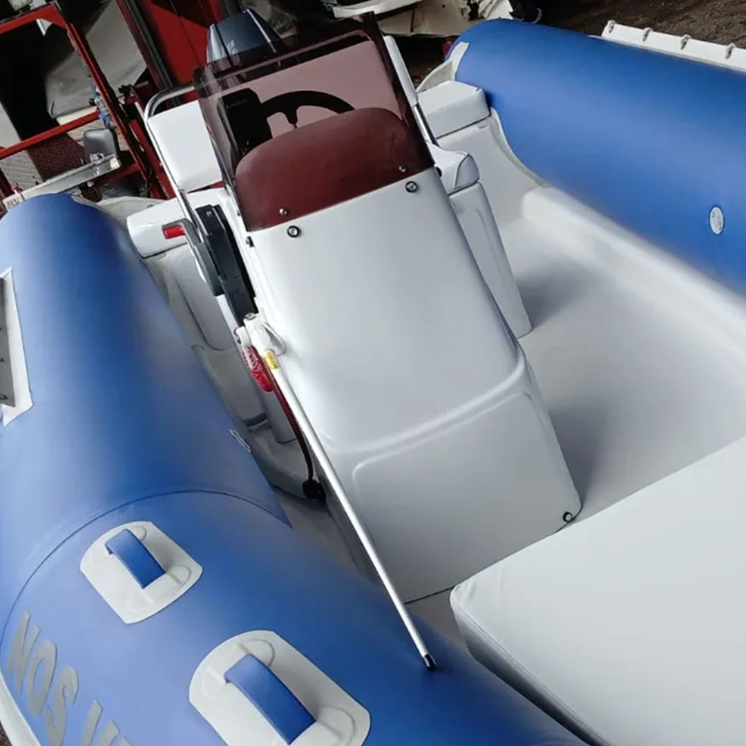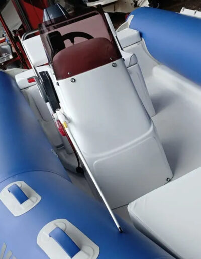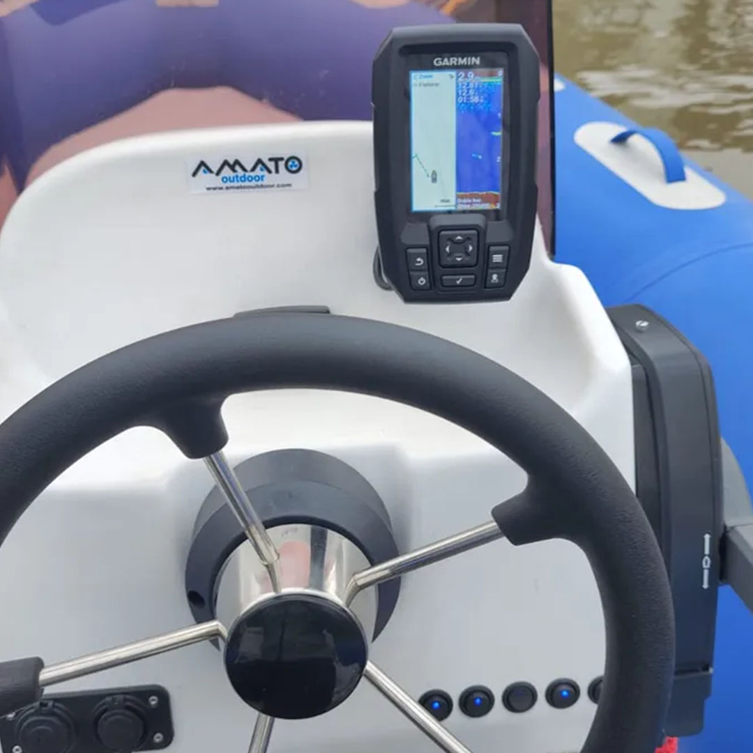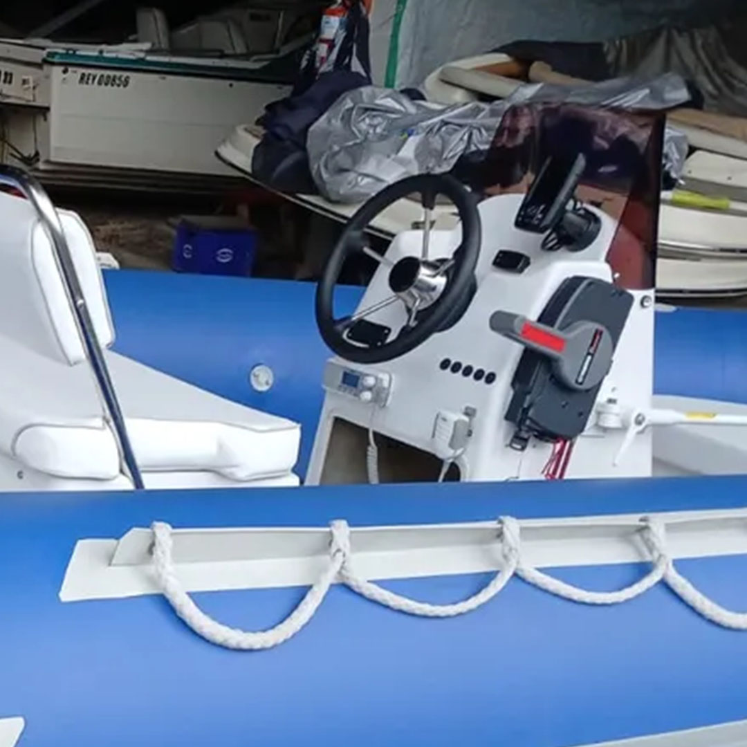 VHF, ecosonda, batería, colchonetas en proa y popa, carpa, parabrisas, timón de acero inoxidable, cuenta-horas, elementos de seguridad
